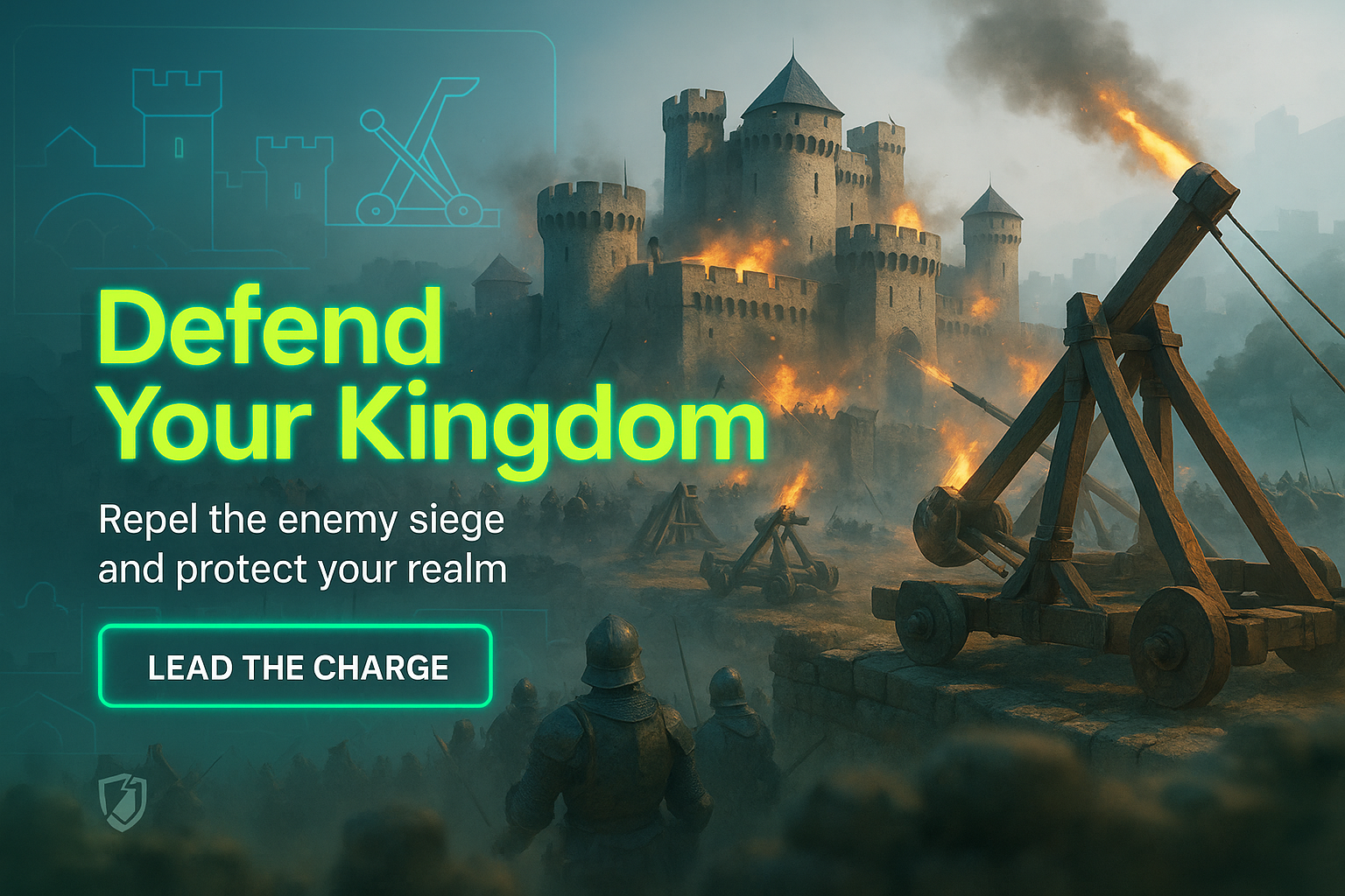 /Collection: /by davooda/Type: PNG/Visually striking promotional graphic for a fantasy game depicting a castle under siege, with catapults and soldiers, ideal for engaging gamers and promoting game features.