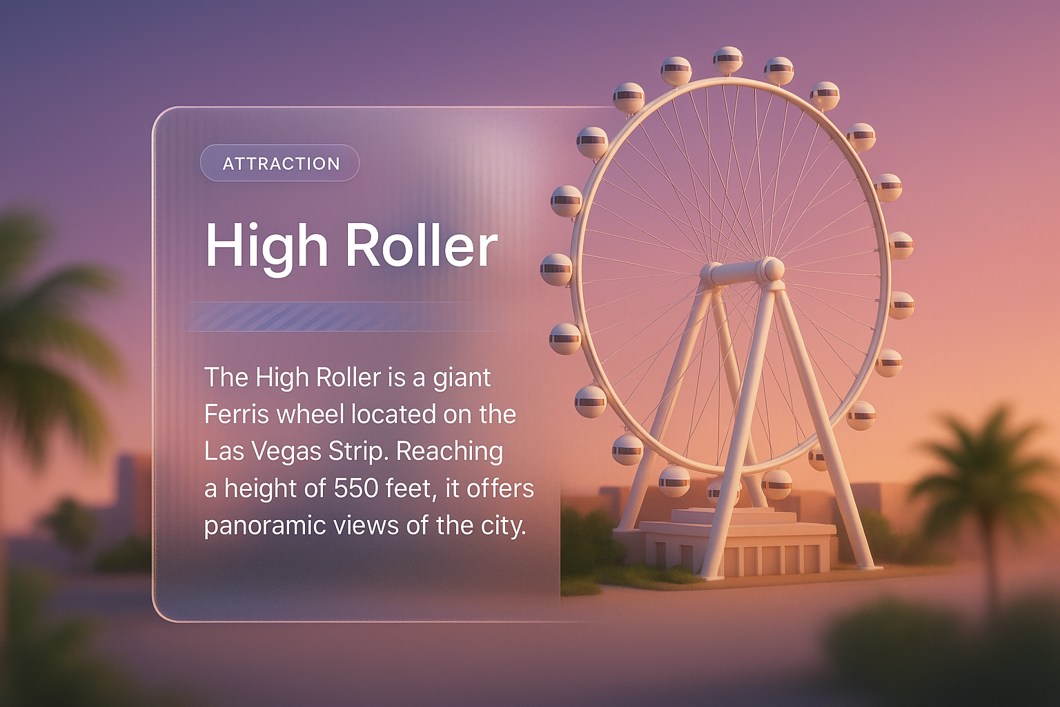 /Collection: /by davooda/Type: PNG/A vibrant 3D illustration of the High Roller Ferris wheel against a gradient sunset background, featuring a transparent info block detailing its height and attraction.