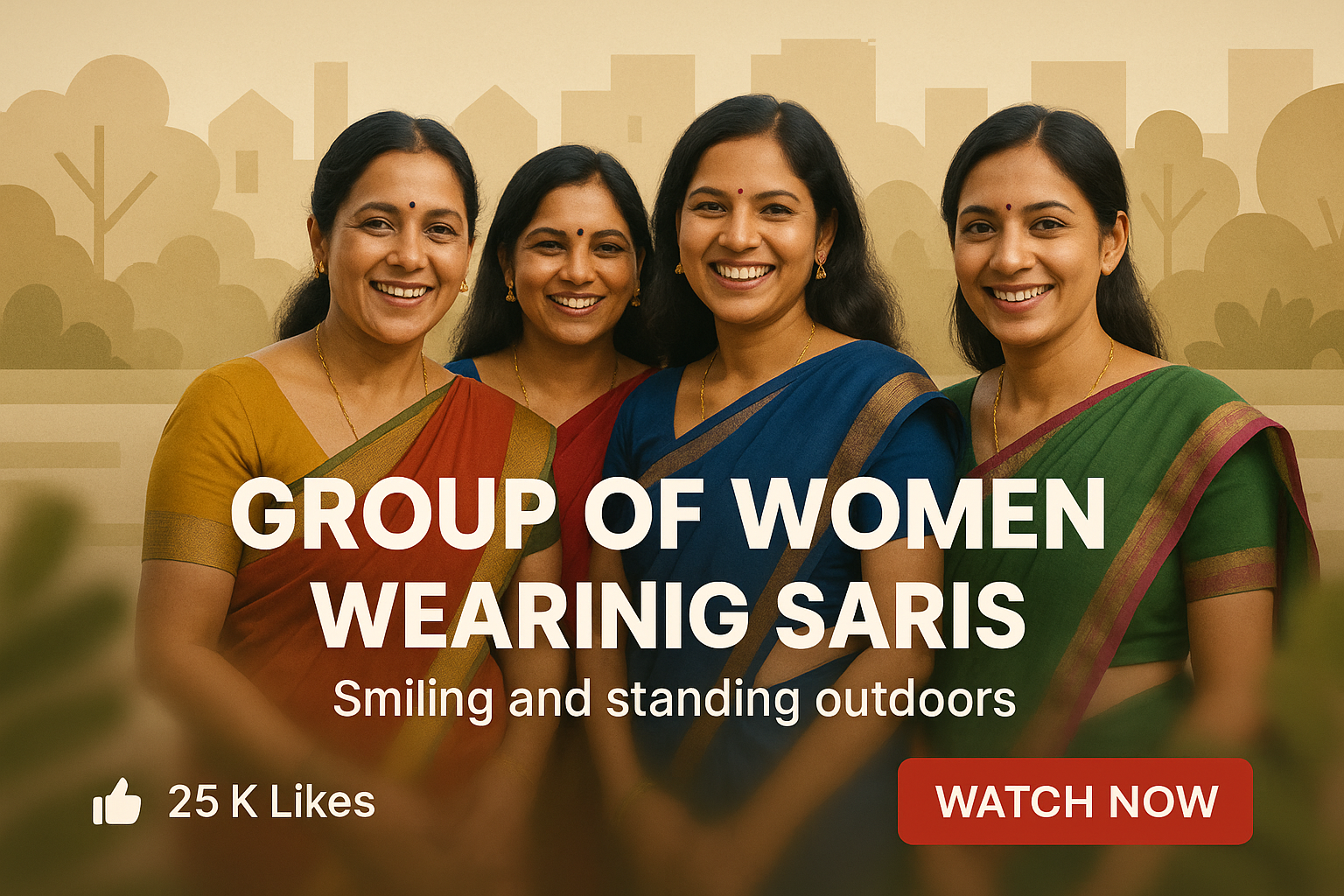 Vibrant social media post featuring a group of women wearing colorful saris, smiling and standing outdoors, evoking cultural celebration and community spirit.