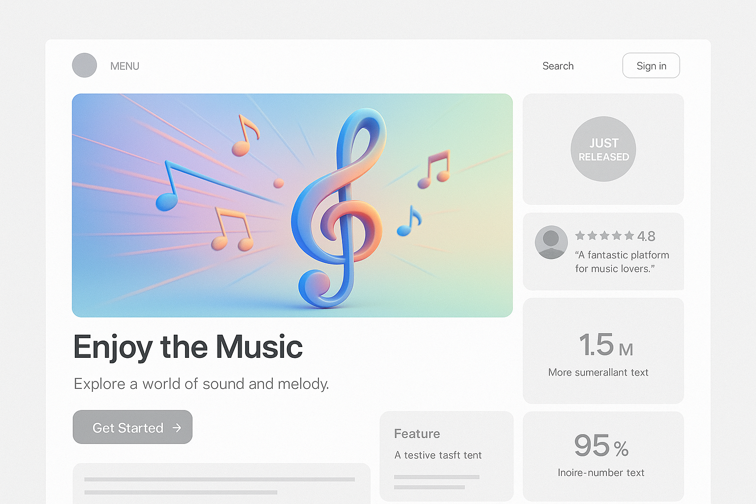 /Collection: /by davooda/Type: PNG/A vibrant 3D landing page design featuring musical notes and a treble clef against a pastel gradient background, showcasing engaging layout with interactive elements.