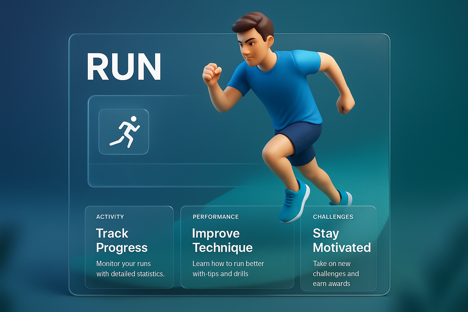 /Collection: /by davooda/Type: PNG/A dynamic 3D illustration showcasing a running app interface, featuring a male runner in action. The design includes sections for tracking progress, improving technique, and staying motivated, all framed in a sleek, modern layout.