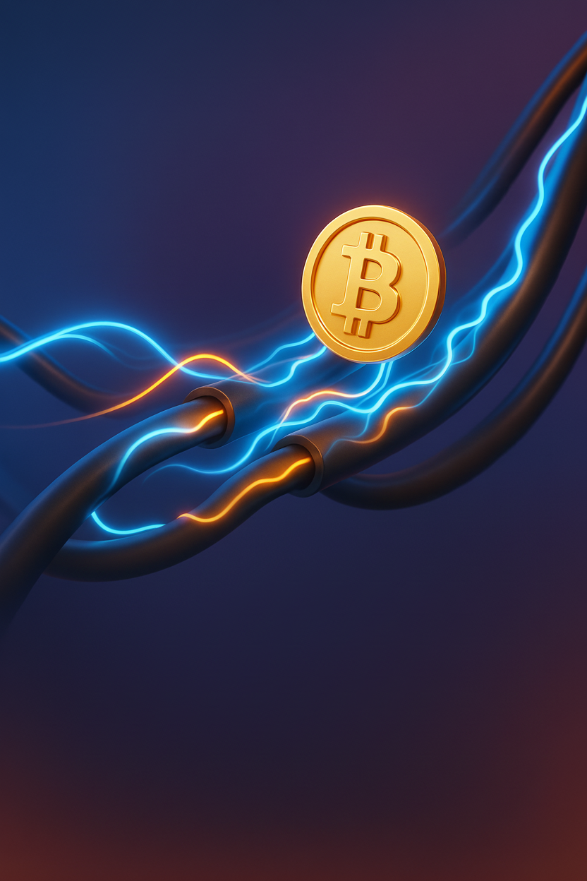 A visually striking representation of Bitcoin intertwined with electric cables, symbolizing the fusion of cryptocurrency and technology. Ideal for financial and tech-related content.