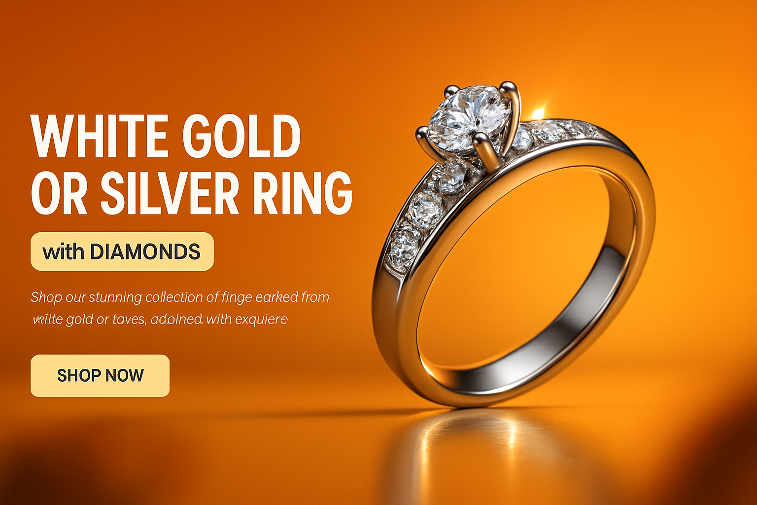 Elegant Jewelry Ad Featuring Diamond Rings in Gold and Silver
