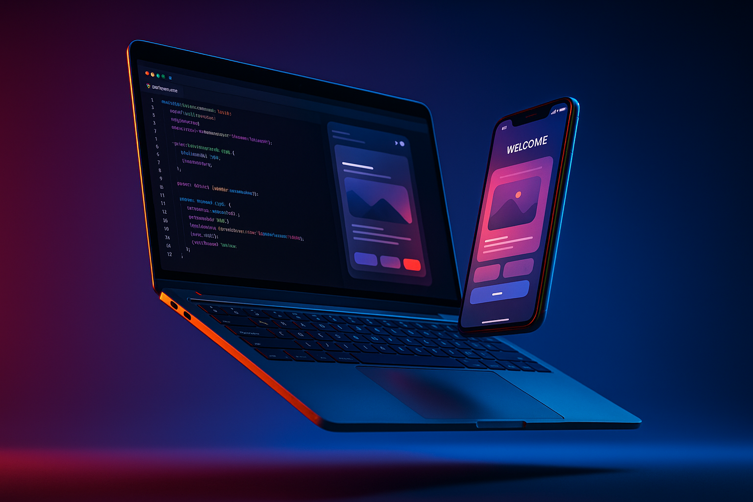 /Collection: /by davooda/Type: PNG/An engaging scene showcasing a laptop and smartphone displaying vibrant app interfaces, illuminated by contrasting side lighting. The background features a smooth gradient, ensuring focus on the devices.