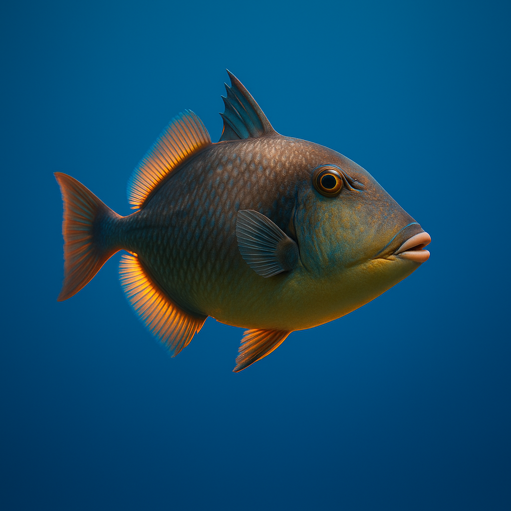 A lifelike depiction of a triggerfish set against a vibrant blue background. The fish is well-lit from both the front and back, showcasing its detailed scales and features.