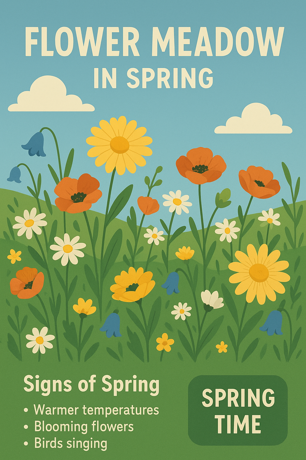 Charming illustration depicting a vibrant flower meadow in spring, featuring various flowers and a clear blue sky, ideal for seasonal promotions or educational content.