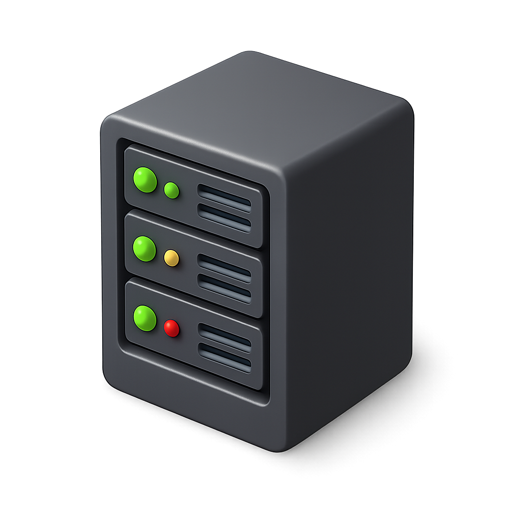 A sleek 3D icon depicting a server rack with three distinct sections, featuring illuminated buttons in green, yellow, and red. The design is volumetric and set against a transparent background.