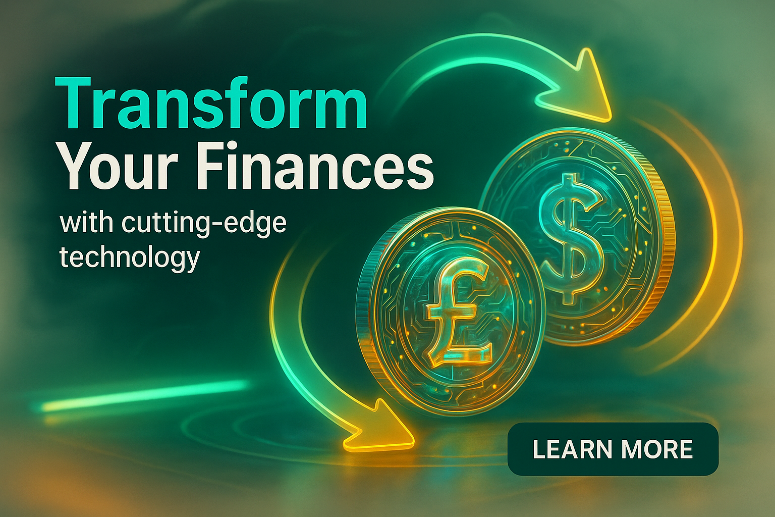 Vibrant promotional banner for financial technology featuring glowing currency symbols, ideal for digital marketing in the fintech sector.