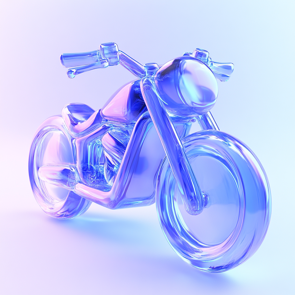 A creative 3D rendering of a motorcycle made from transparent materials, showcasing smooth curves and modern design. Ideal for use in digital art presentations or product showcases.