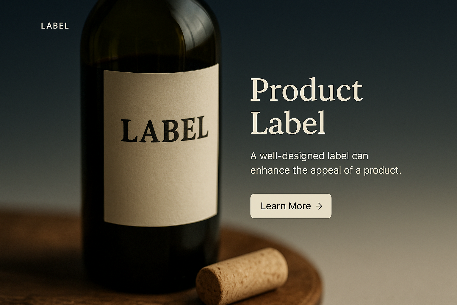 The image features a product label on a wine bottle with a gradient background. It includes a short header and a text block emphasizing the importance of design in product appeal.