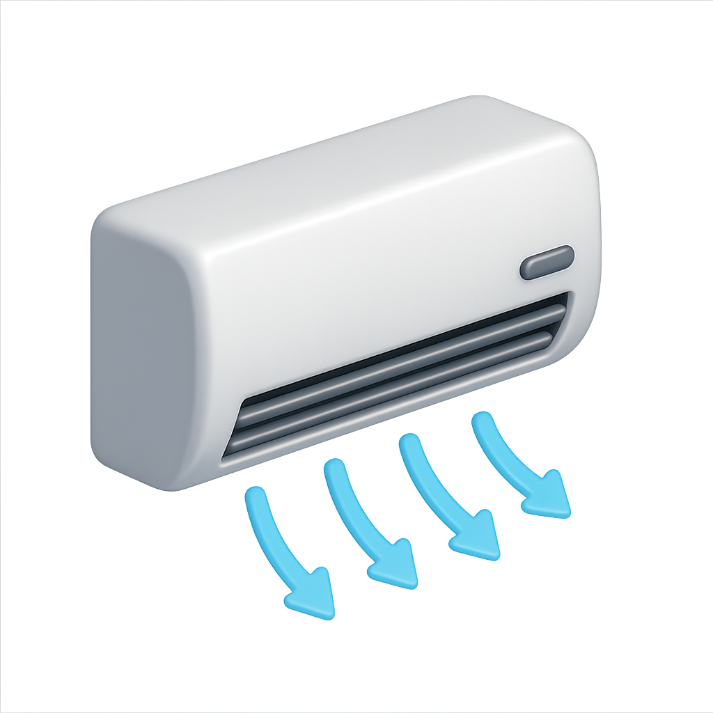 A stylized 3D icon of an air conditioner, depicted in a three-quarter view. It features a sleek design with cooling arrows emanating from the unit, set against a soft background.