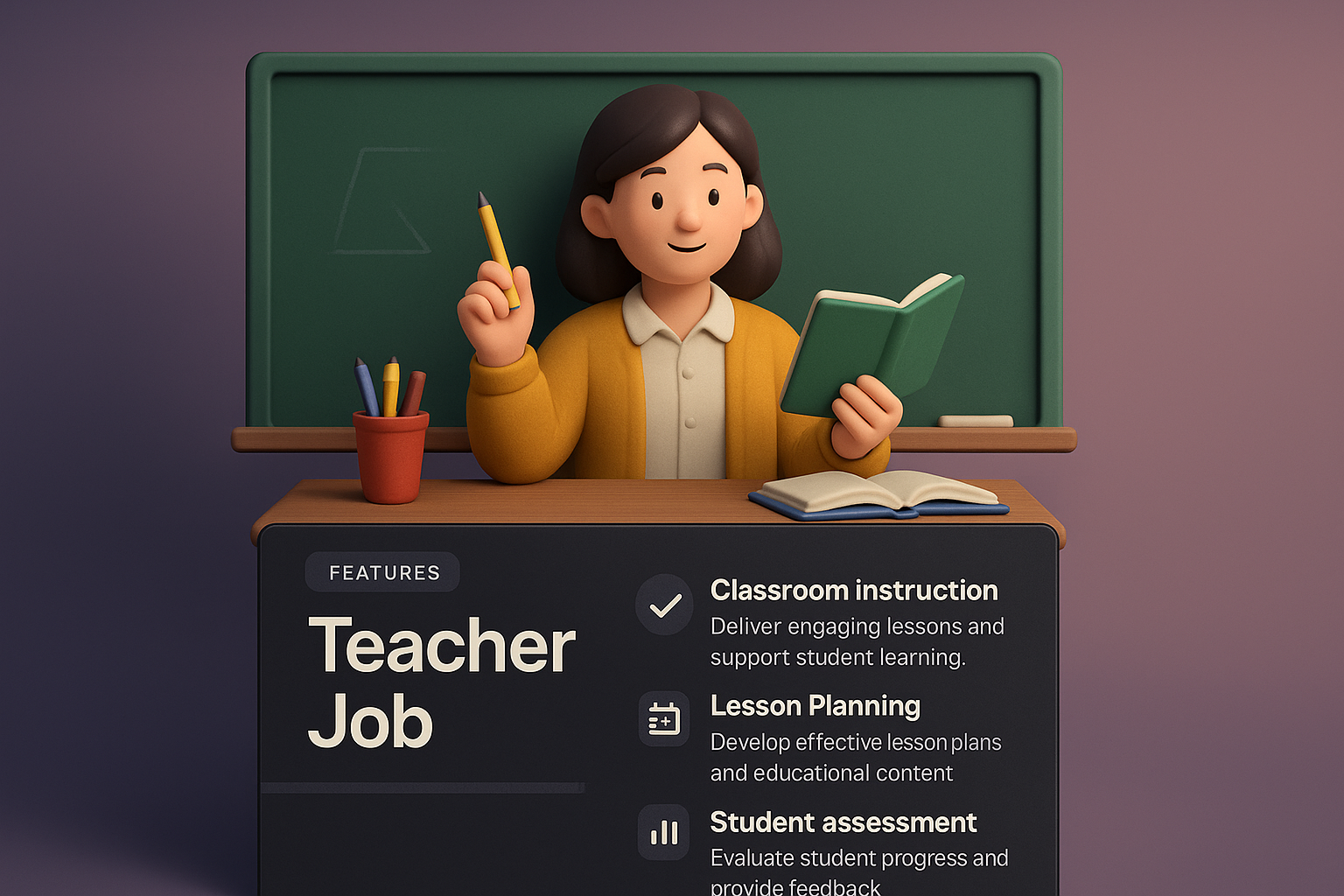 A 3D illustration of a teacher in a classroom setting, showcasing key features like lesson planning and student assessment in a visually appealing format.