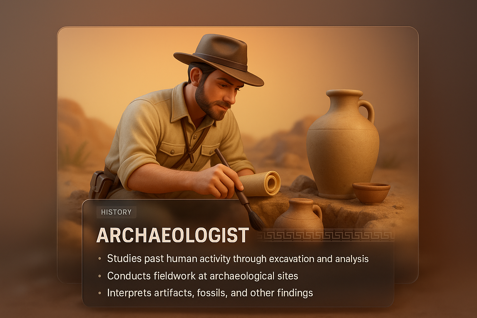 A detailed 3D illustration showcasing an archaeologist examining artifacts at a dig site. The image features a gradient background and integrated text blocks with relevant information.