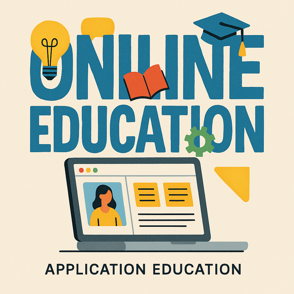 Vibrant graphic representing online education, featuring a laptop and educational icons. Ideal for educational platforms or promotional materials.