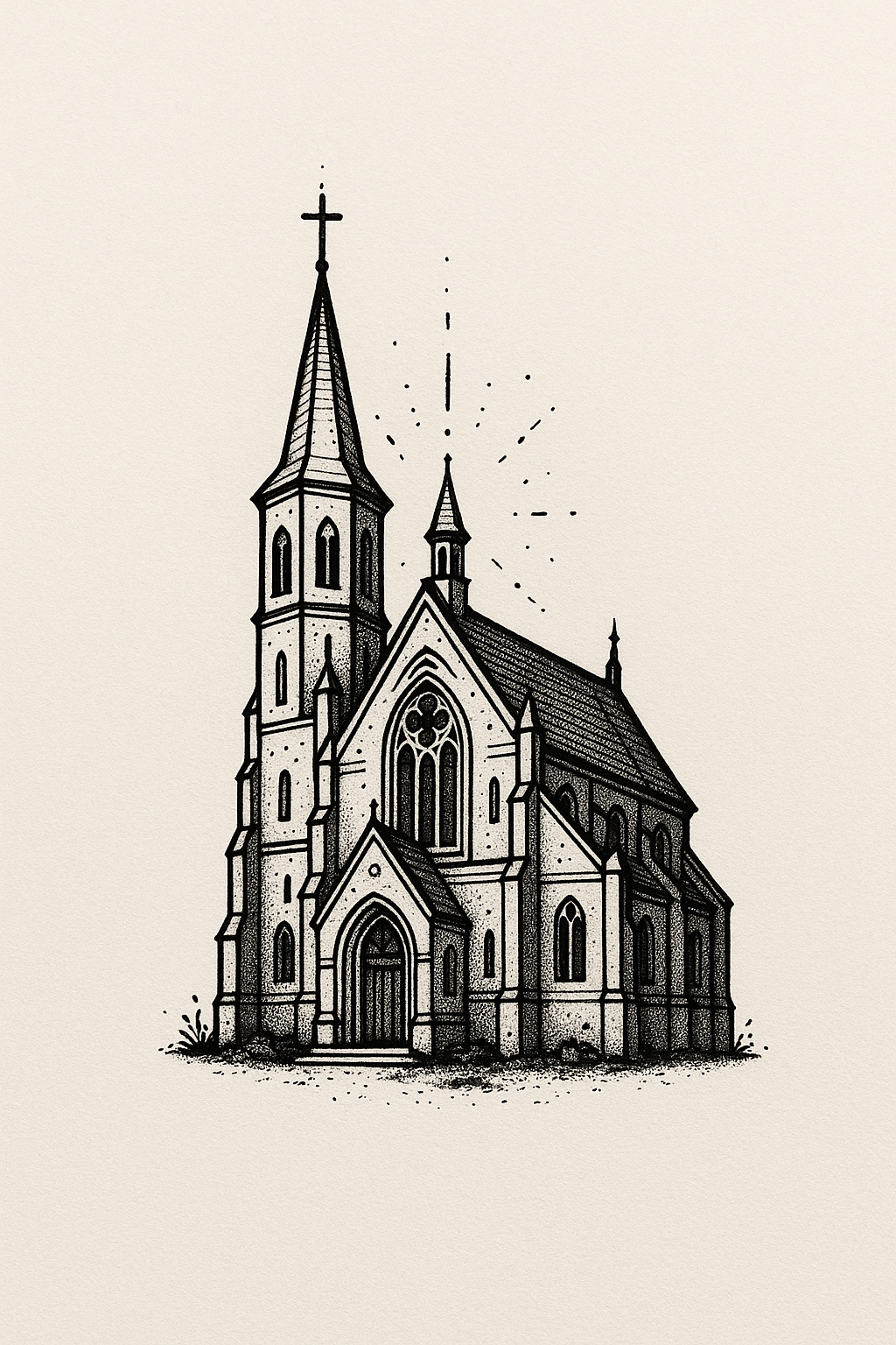 This image features a detailed black and white illustration of a Gothic-style church with a prominent steeple. It is ideal for art prints or architectural presentations.
