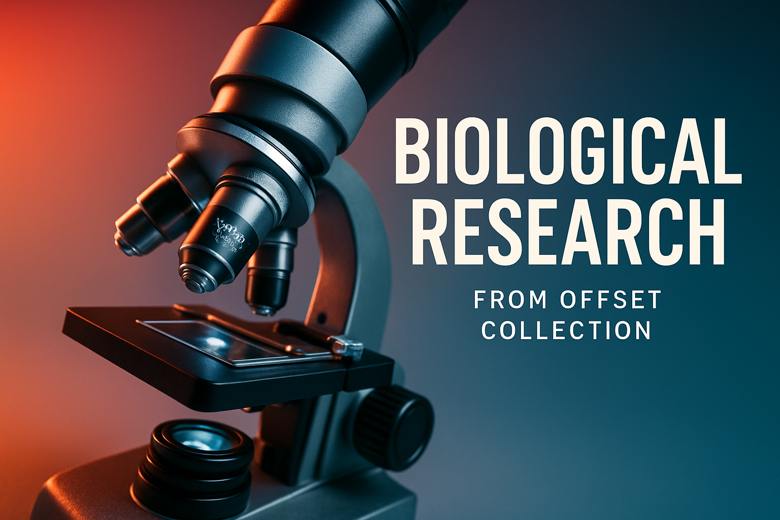 /Collection: /by davooda/Type: PNG/A striking advertisement showcasing a microscope from the Offset Collection. The dynamic angle and gradient background create a cinematic and energetic atmosphere, emphasizing the theme of biological research.
