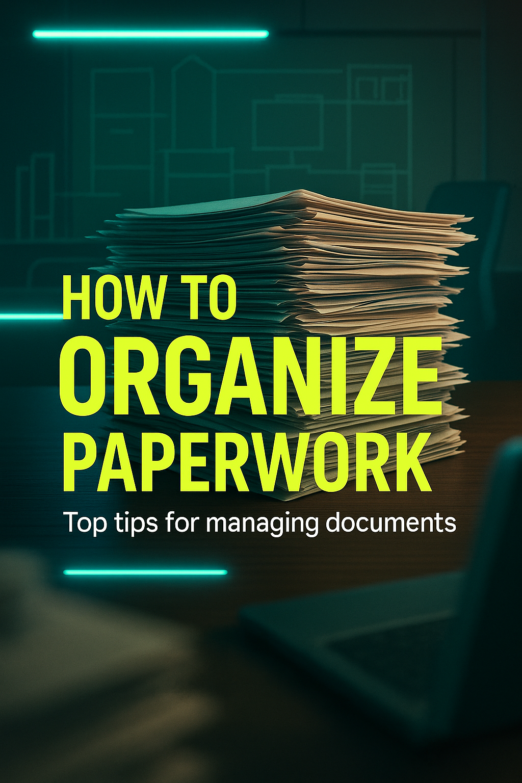A visually engaging graphic designed to provide tips on organizing documents, featuring a stack of paperwork set against a modern workspace background. Ideal for educational or professional use.