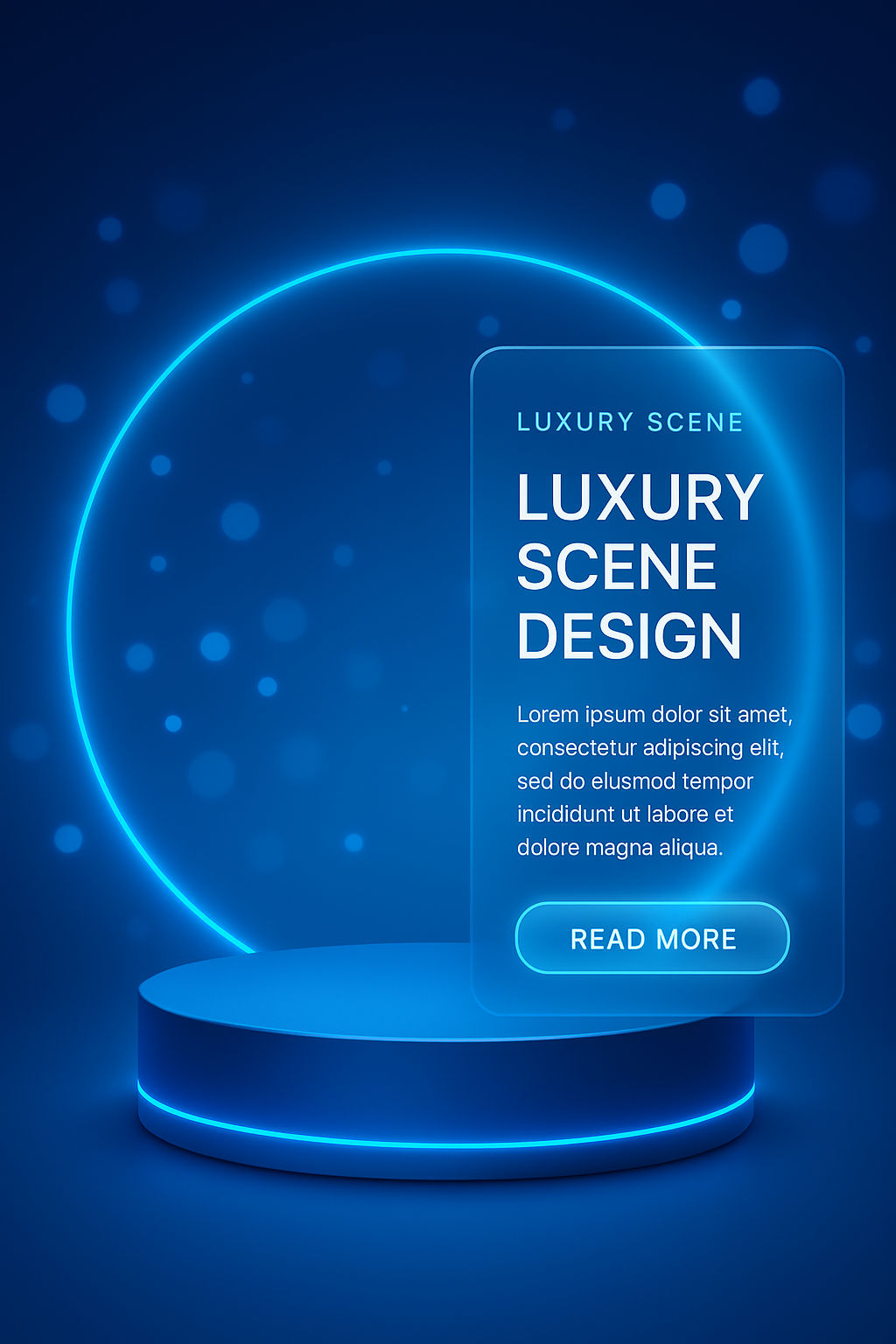 /Collection: /by davooda/Type: PNG/An empty blue podium set against a dark background featuring neon effects and bokeh decorations. The design includes glassmorphism panels with glowing edges.