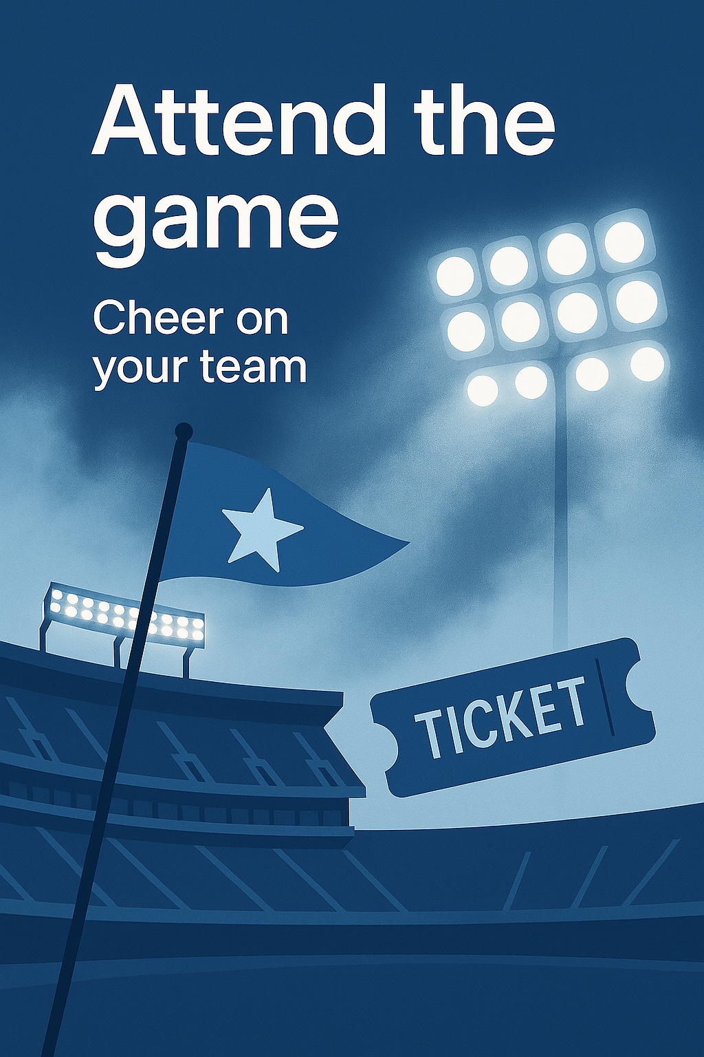 Engaging promotional graphic encouraging attendance at a sports event, featuring a ticket and a cheering flag. Ideal for marketing campaigns targeting sports fans.