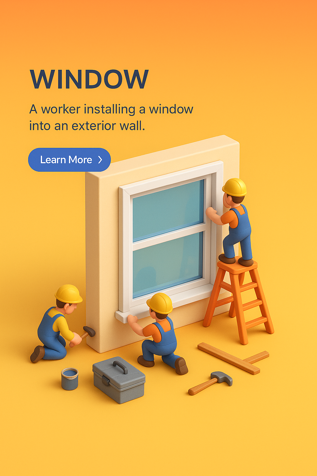 A vibrant 3D scene depicting workers installing a window on an exterior wall. The scene features small characters using tools, creating a realistic and engaging visual.