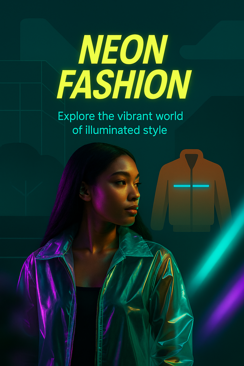 Captivating promotional graphic showcasing neon fashion with a focus on illuminated style. Ideal for fashion marketing and social media campaigns.
