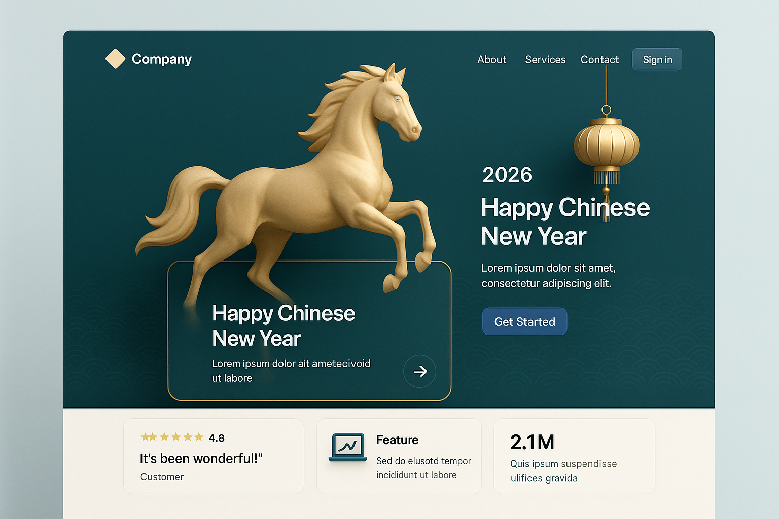 /Collection: /by davooda/Type: PNG/A modern landing page design featuring a 3D golden horse, festive elements, and a clean layout. The page includes sections for features, testimonials, and stats for a New Year celebration.