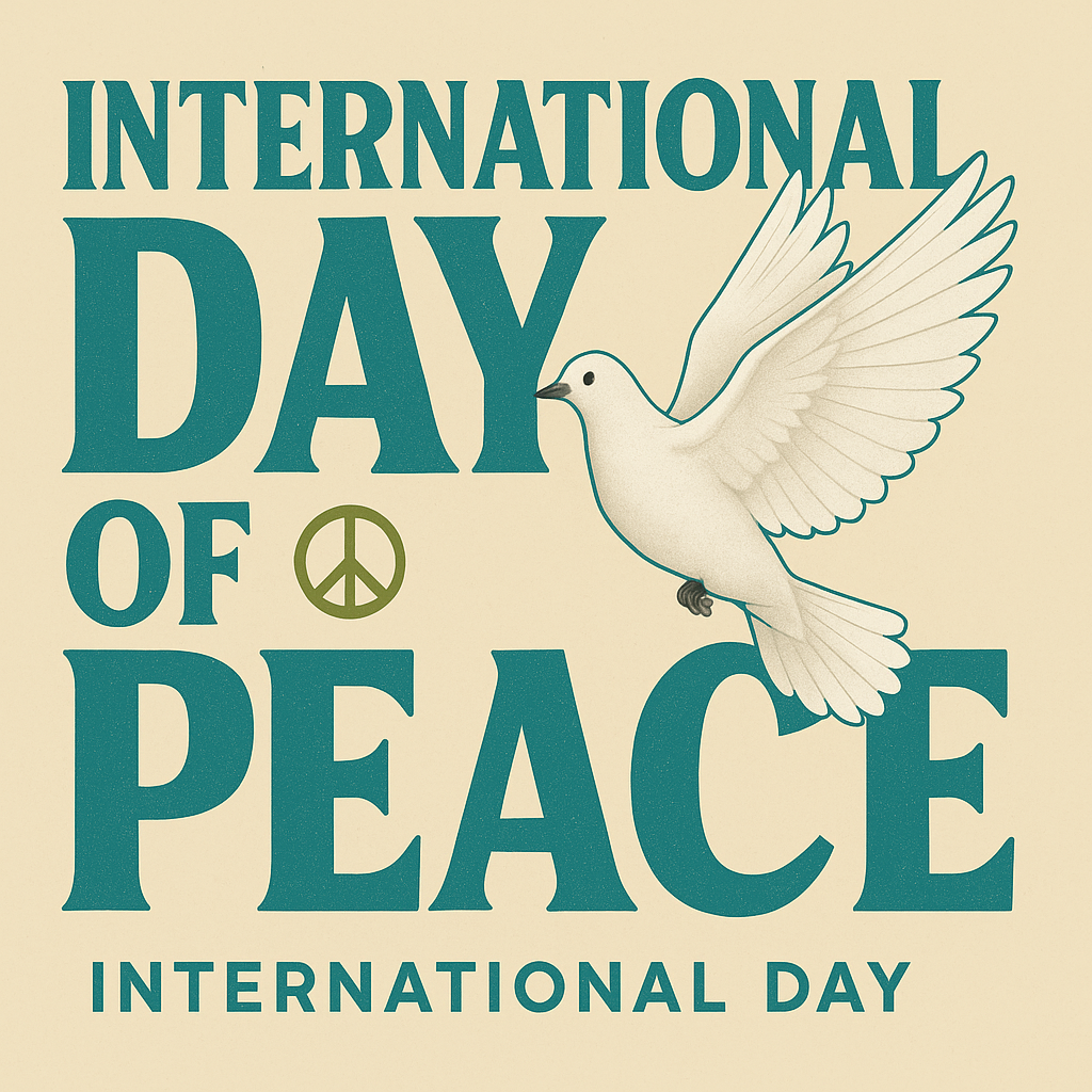 /Collection: /by davooda/Type: PNG/Illustrative graphic celebrating the International Day of Peace, featuring a dove and bold typography in a harmonious color palette, suitable for social media and awareness campaigns.