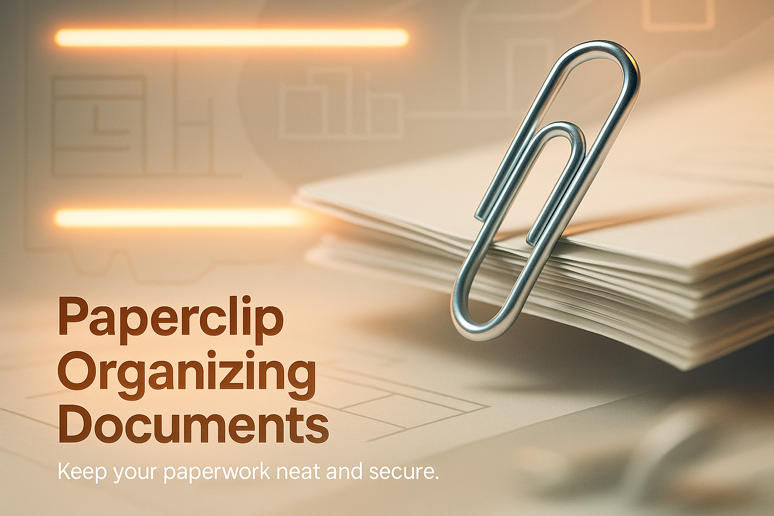 /Collection: /by davooda/Type: PNG/A modern graphic showcasing a paperclip and stacked papers, designed to convey the theme of document organization. Ideal for office-related content and productivity tips.