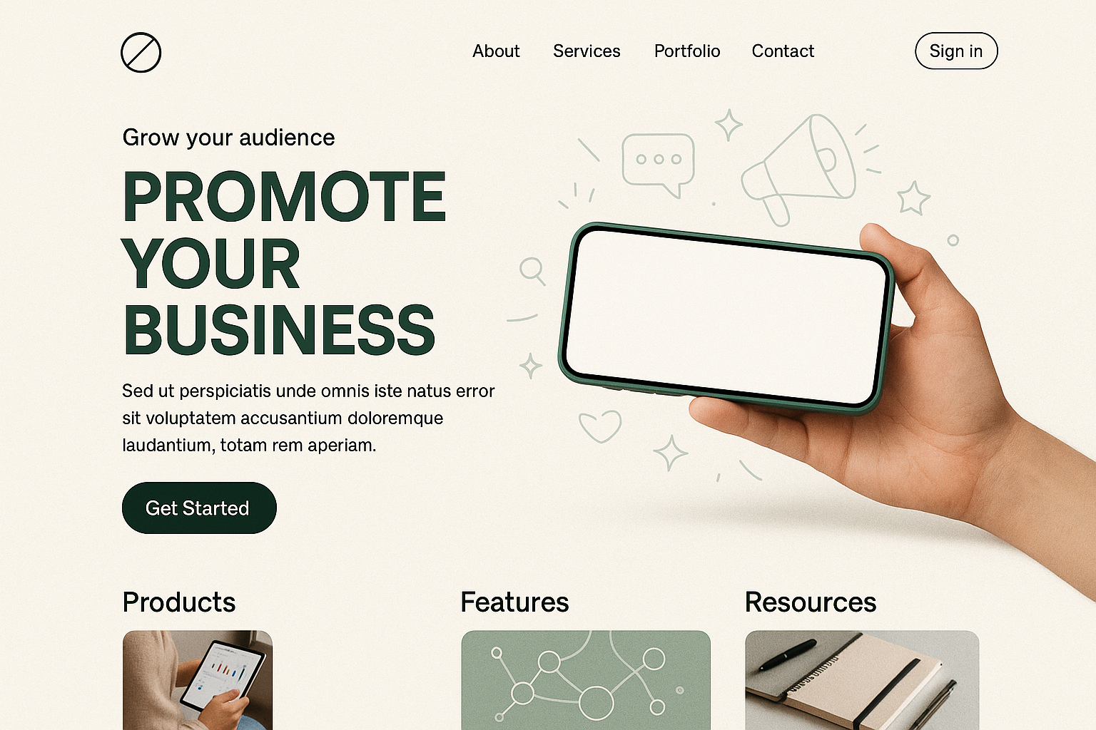 /Collection: /by davooda/Type: PNG/A modern landing page featuring a smartphone held in hand, showcasing bold typography. The layout includes sections for products, features, and resources, all in a minimalist style.