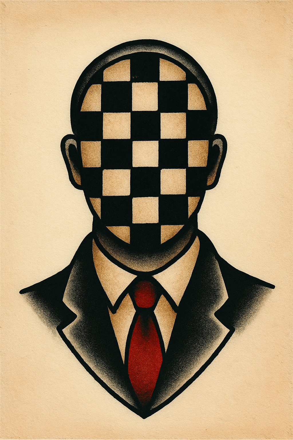 /Collection: /by davooda/Type: PNG/This image features a unique tattoo design depicting a silhouette of a person with a chessboard pattern where the face would be. The classic style is complemented by a beige background.