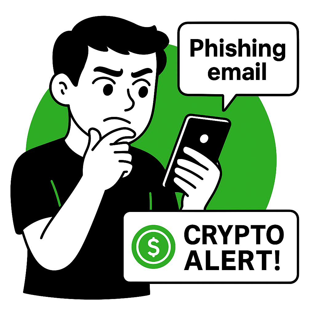 /Collection: /by davooda/Type: PNG/A digital illustration depicting a concerned individual looking at a phone, conveying a warning about phishing emails related to cryptocurrency. Suitable for cybersecurity awareness campaigns.