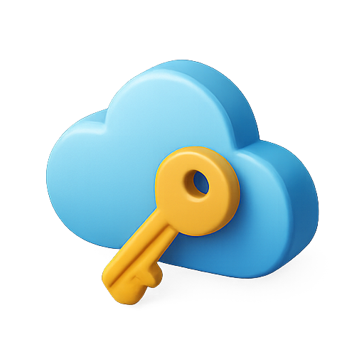 A visually appealing 3D graphic depicting a cloud with a key, symbolizing data security and access control. Ideal for tech-related content and security services.
