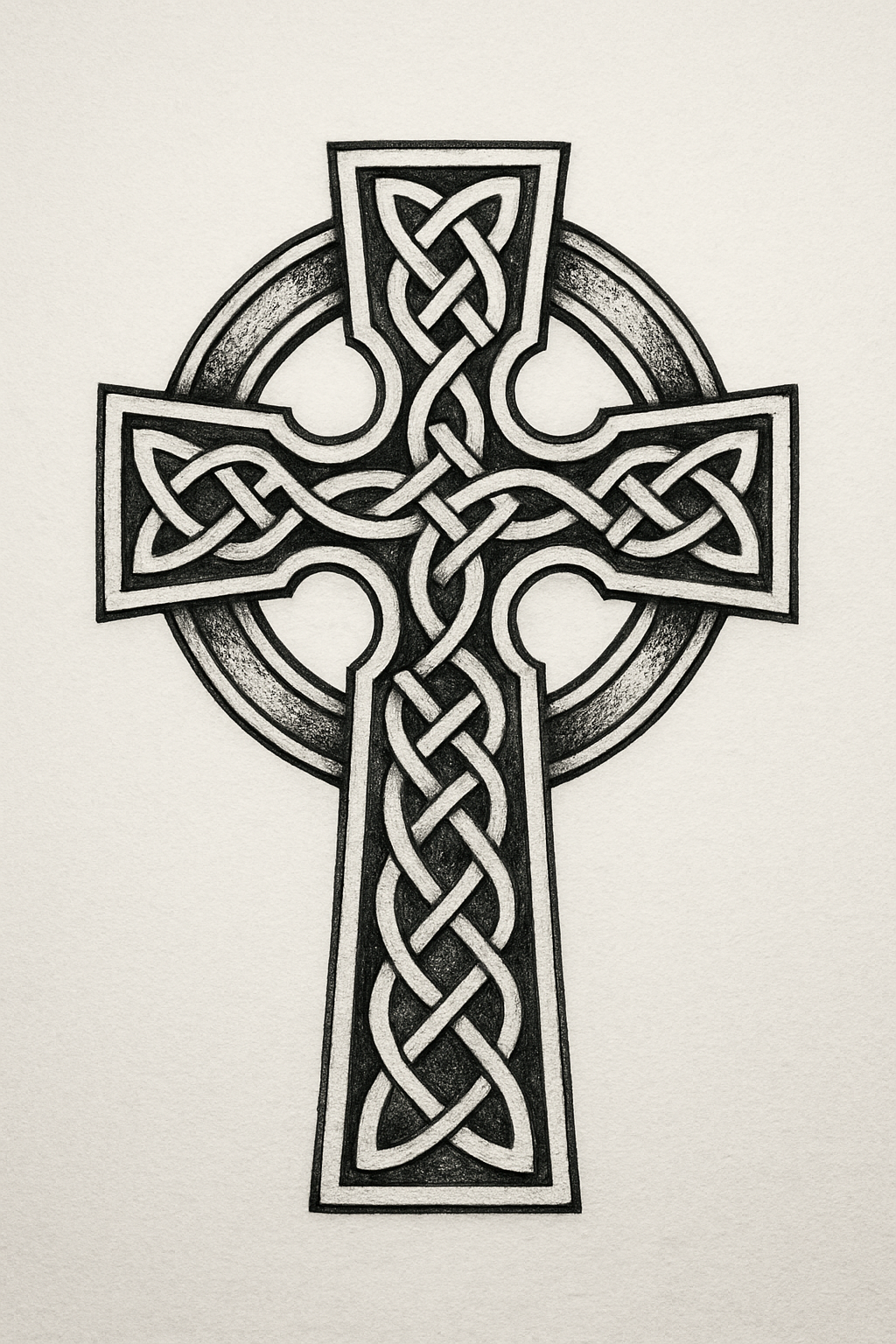 A detailed black and white illustration of a Celtic knot cross, showcasing intricate patterns and designs. Ideal for art enthusiasts and cultural representation.