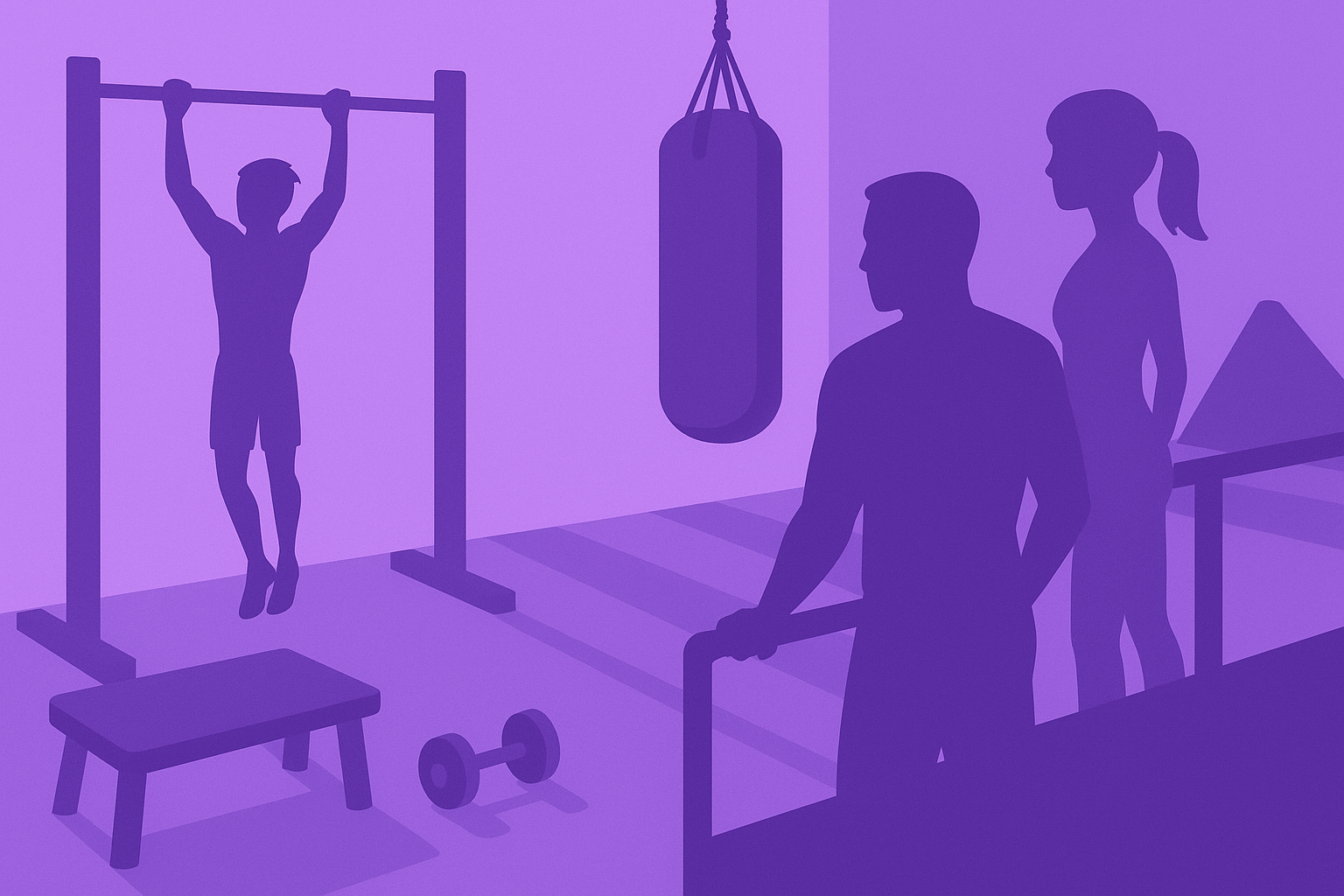 Silhouetted Fitness Scene in a Purple Gym Setting
