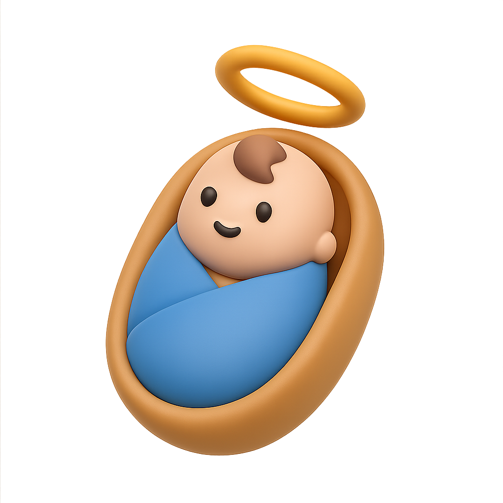 A playful 3D isometric icon featuring a smiling baby wrapped in a blue blanket, nestled in an oval shape with a golden halo above. The design has a soft, volumetric feel.