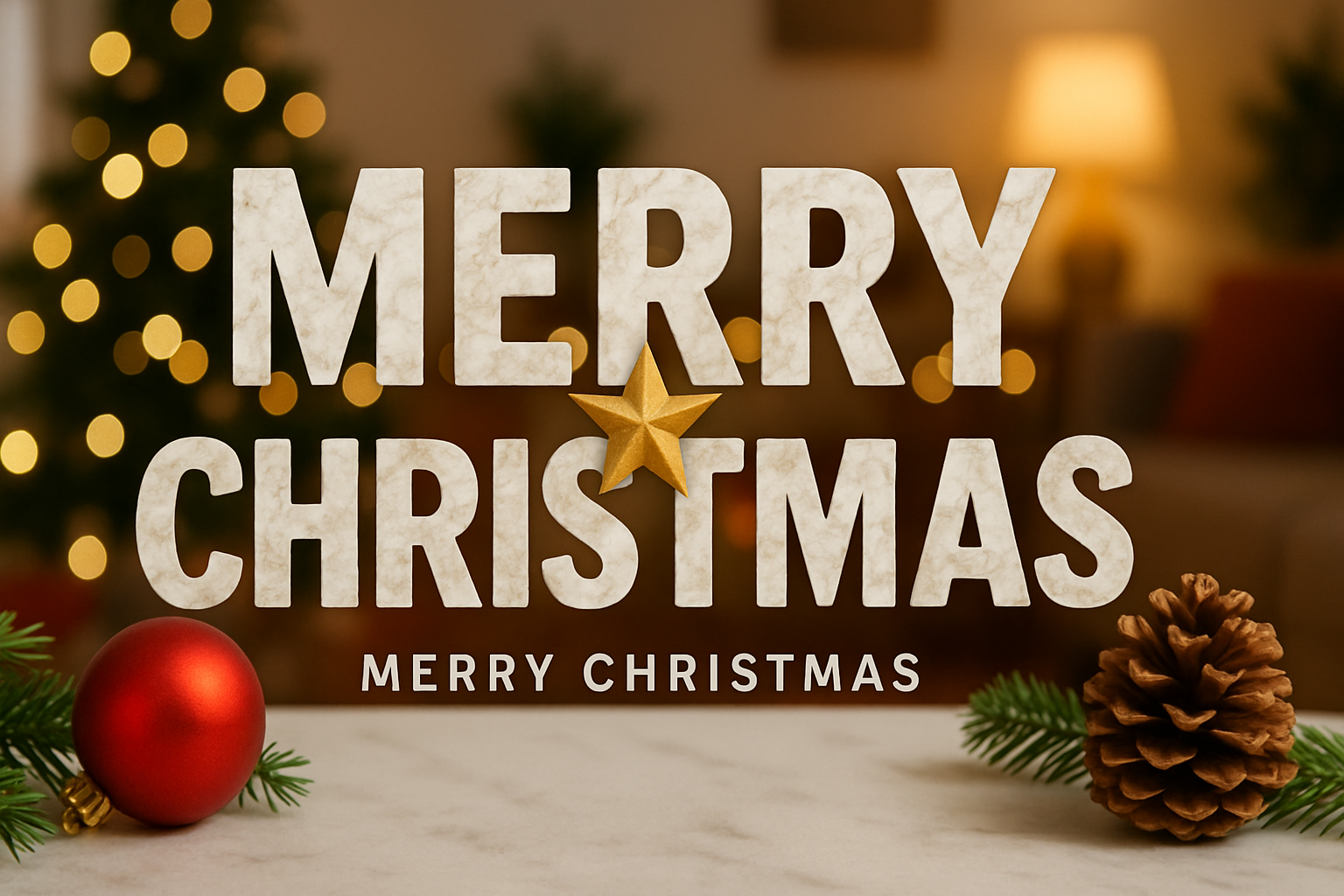 /Collection: /by davooda/Type: PNG/A warm and inviting Christmas-themed graphic featuring a bold 'Merry Christmas' message with decorative elements, ideal for holiday greeting cards or social media posts.