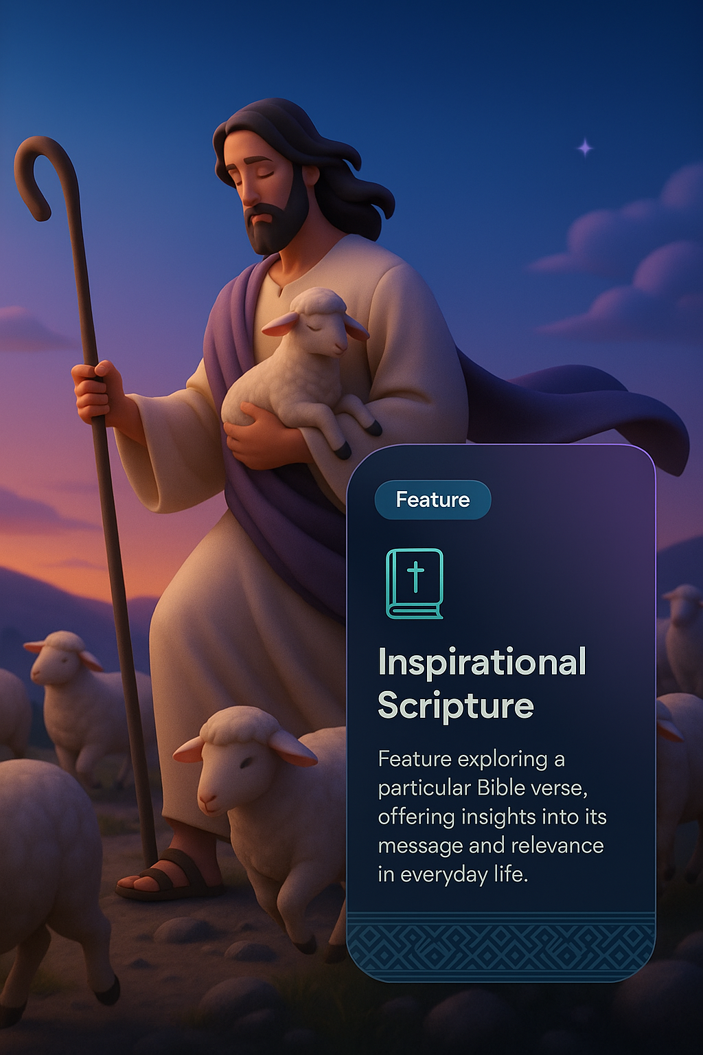 A serene scene depicting Jesus as a shepherd holding a sheep, surrounded by a flock under a beautifully colored evening sky. The image features a modern 3D illustration style.