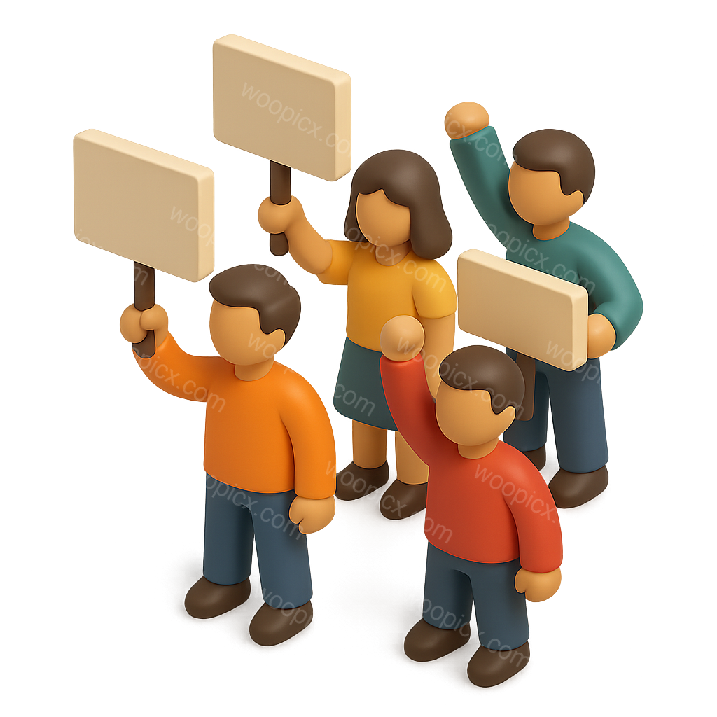 A 3D isometric representation of four stylized figures holding blank signs, symbolizing a protest. The figures are colorful and designed with a volumetric feel, set against a gradient background.