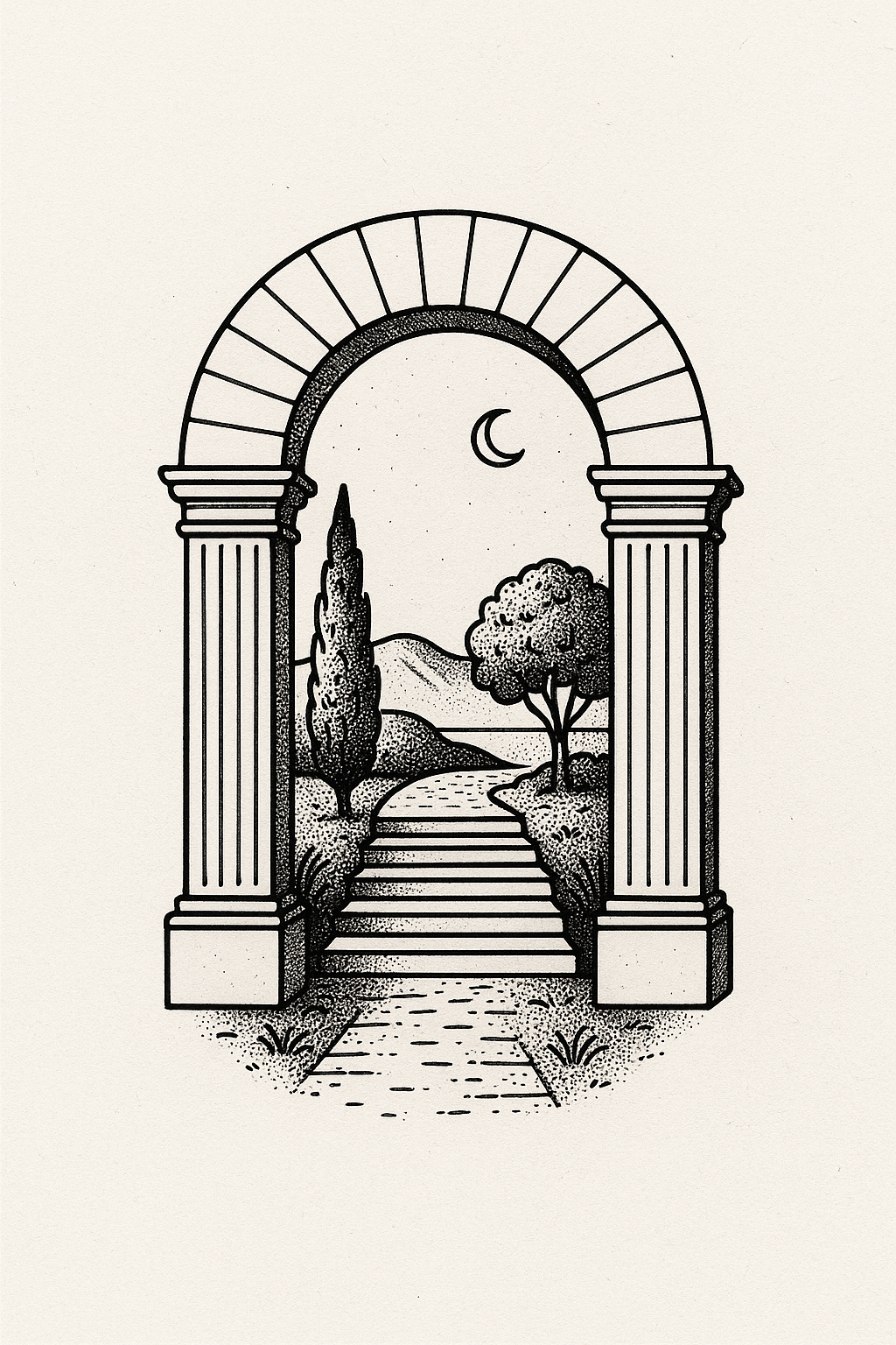 /Collection: /by davooda/Type: PNG/This is a detailed illustration of an archway leading to a serene landscape. The monochromatic style features trees, hills, and a crescent moon, ideal for art prints or decor.
