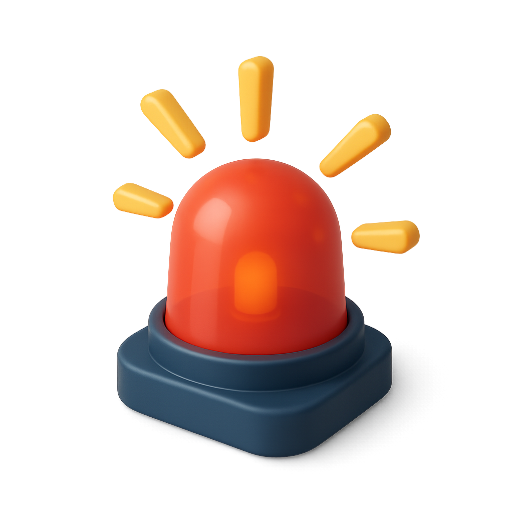 A 3D representation of an emergency light with a glossy red dome and bright yellow rays. The icon has a base and showcases a three-quarter view with a transparent background.