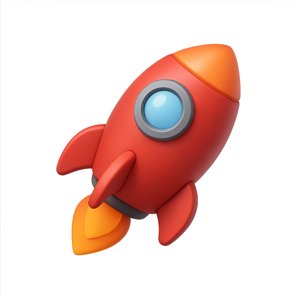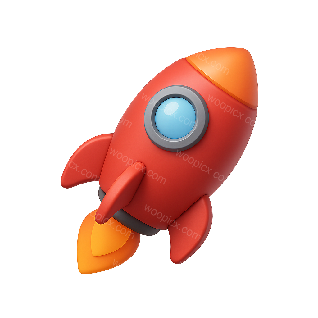 A vibrant 3D rocket icon depicted in a three-quarter view, featuring a bright red body, orange nose cone, and blue circular window. The design has a smooth, volumetric feel with a glowing flame at the base.