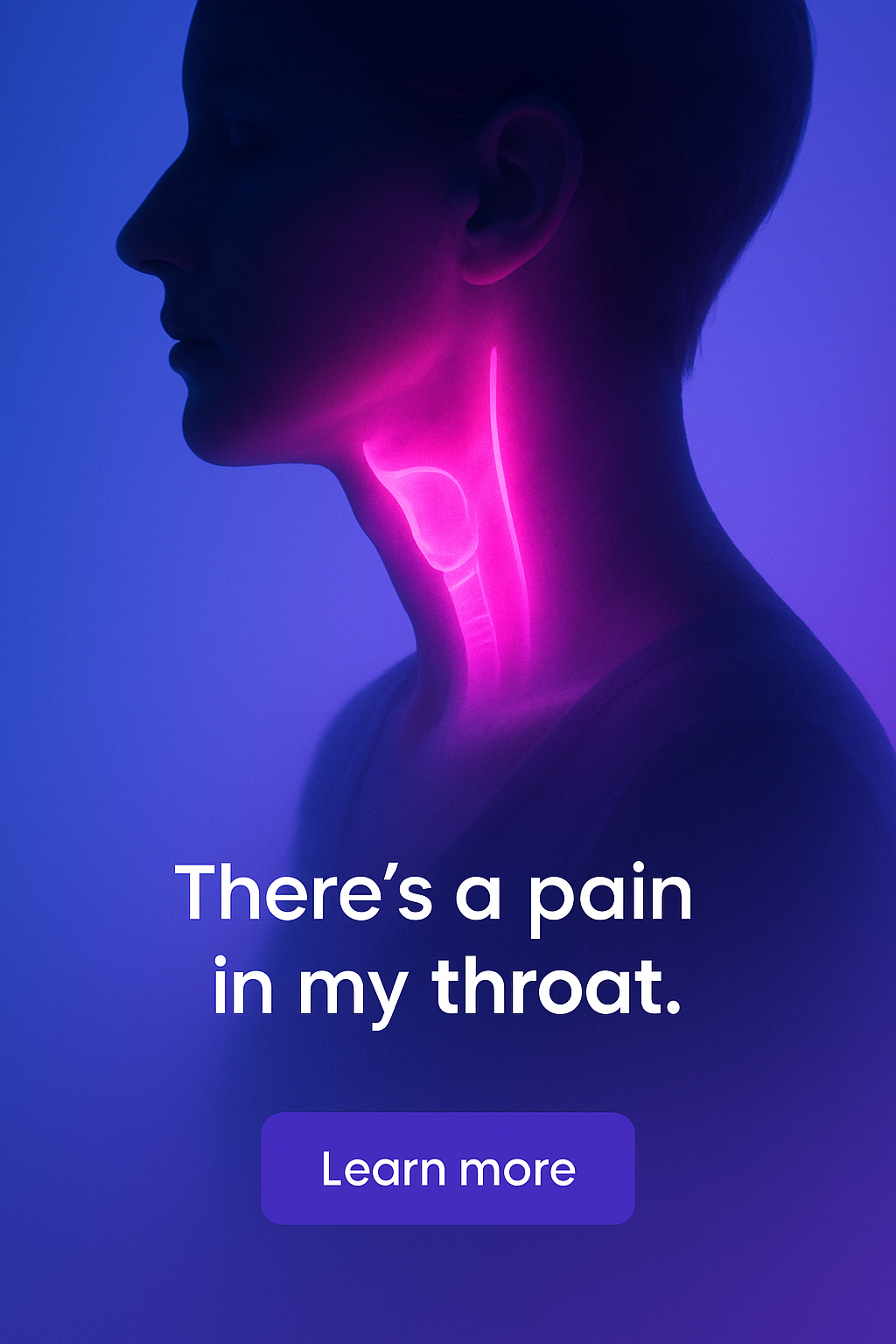 /Collection: /by davooda/Type: PNG/An artistic representation focusing on the throat, highlighted by an intense neon-pink glow that emanates through a semi-transparent material. The surrounding space is illuminated in cool shades of blue to violet against a solid blue background.