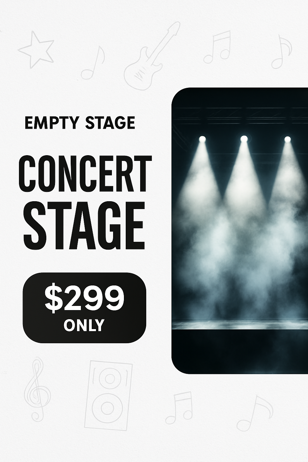 /Collection: /by davooda/Type: PNG/An empty concert stage featuring illuminated spotlights and smoke, designed for advertisement with a clean layout and bold typography. The background is a light textured white with contour drawings.