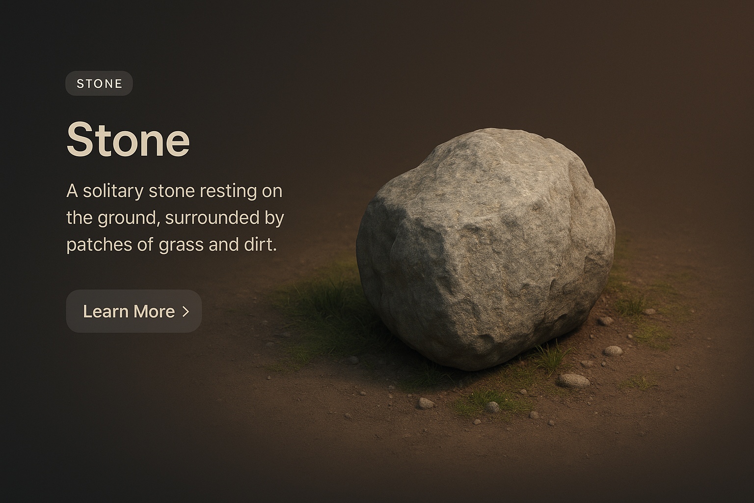 A realistic 3D depiction of a solitary stone on the ground, surrounded by grass and dirt patches. The dark gradient background enhances the stone's features.