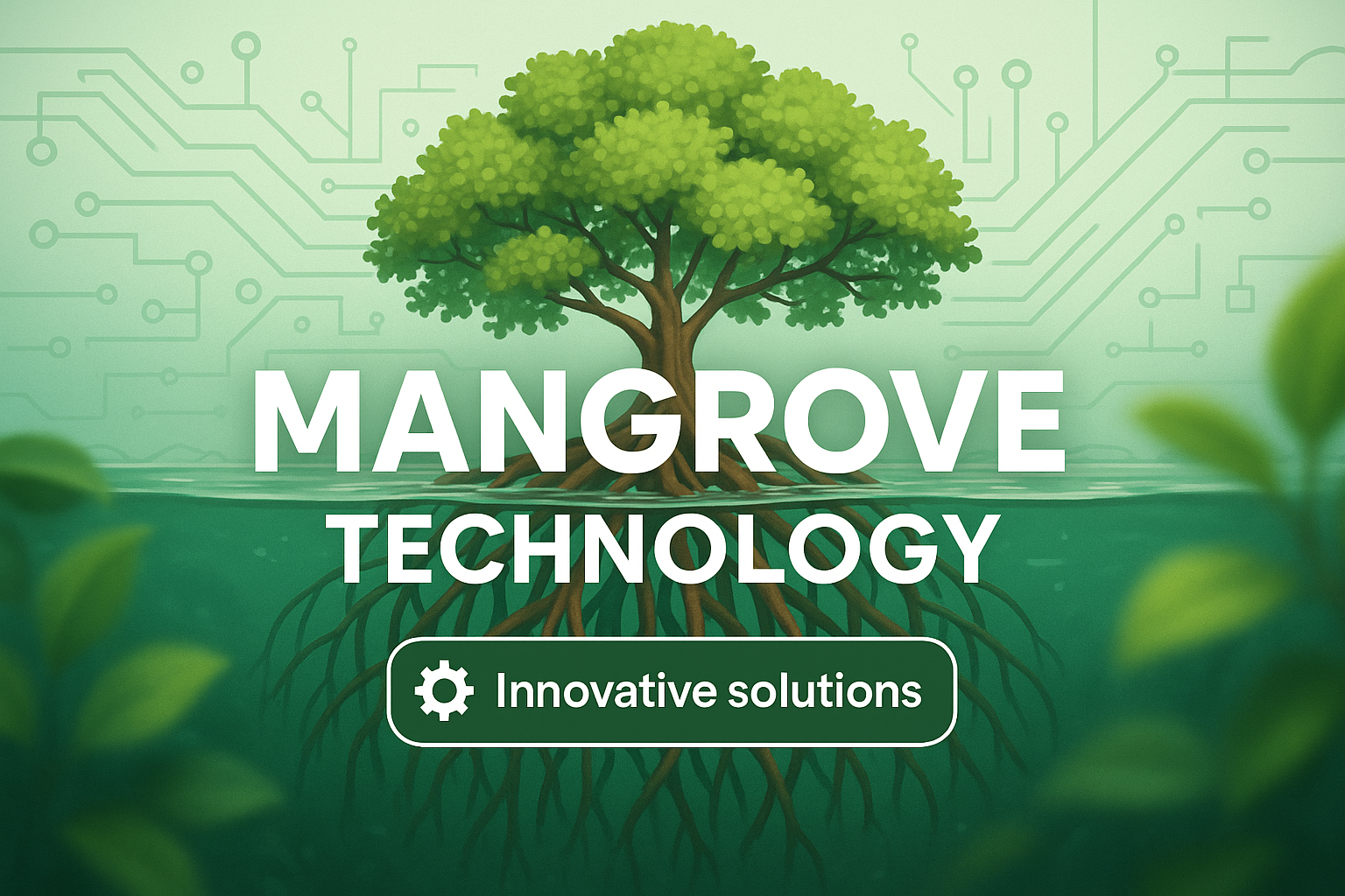/Collection: /by davooda/Type: PNG/A visually appealing graphic illustrating the concept of Mangrove Technology, combining nature and technology elements, ideal for promoting innovative solutions in environmental tech.