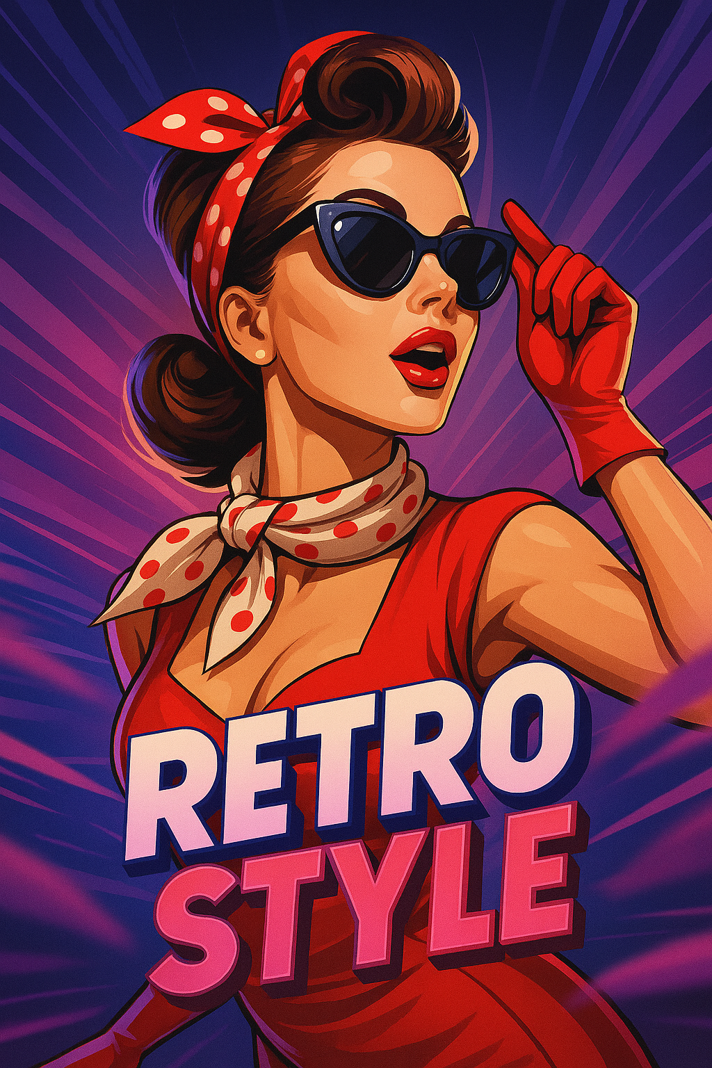 /Collection: /by davooda/Type: PNG/A vibrant illustration of a fashionable woman in trendy sunglasses, styled in a retro pin-up aesthetic. The dynamic background features rays of color, enhancing the lively composition.