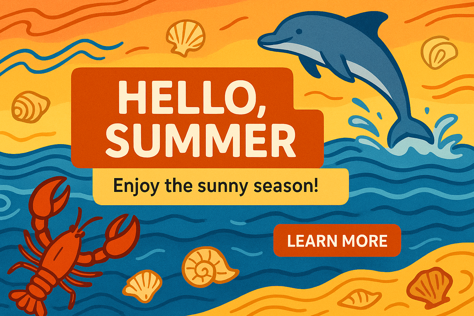 Colorful and playful summer-themed graphic featuring marine elements like a dolphin and lobster, perfect for social media engagement and seasonal promotions.