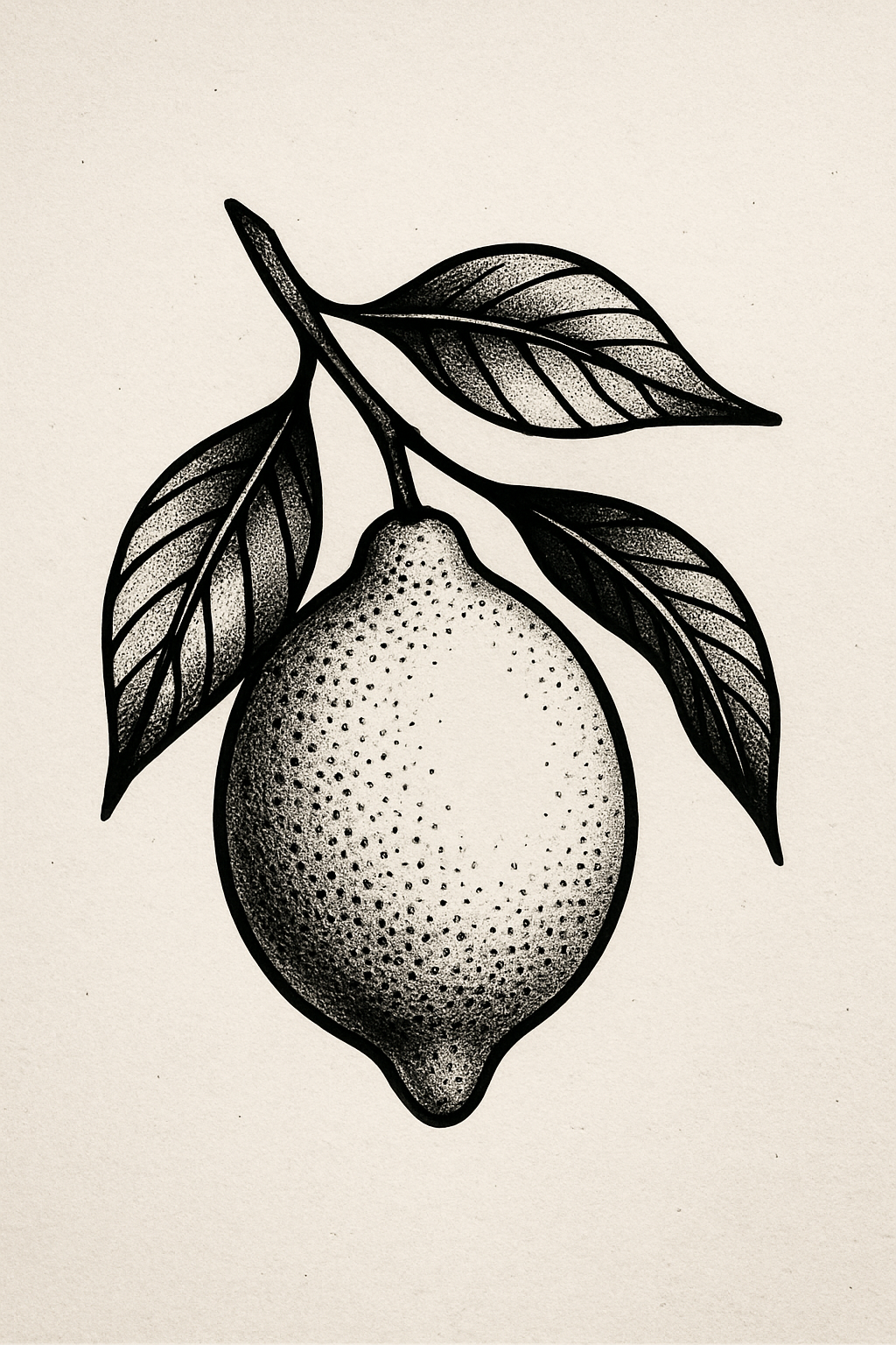 This image features a detailed black and white illustration of a lemon with leaves. It has a vintage style, suitable for botanical art or food-related themes.