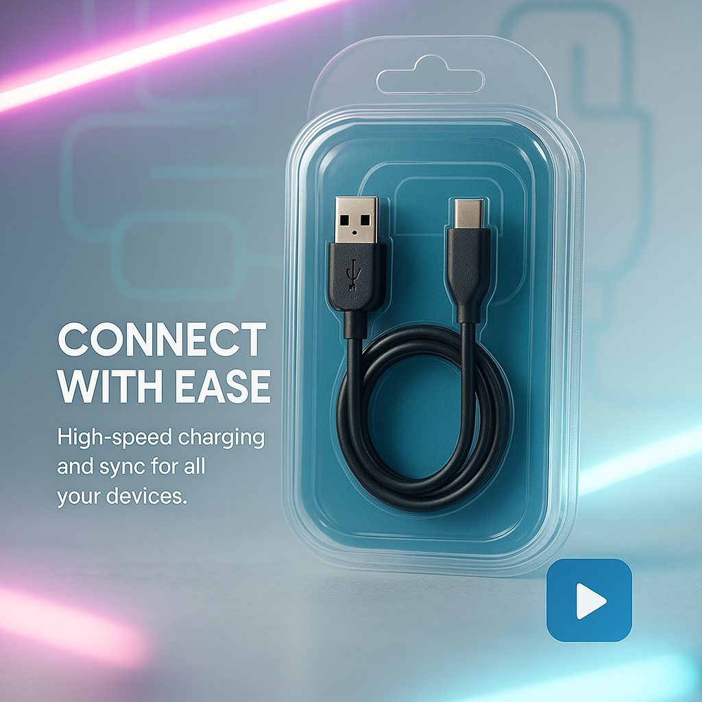 Modern product mockup showcasing a USB-C charging cable in sleek packaging, ideal for e-commerce and tech marketing.