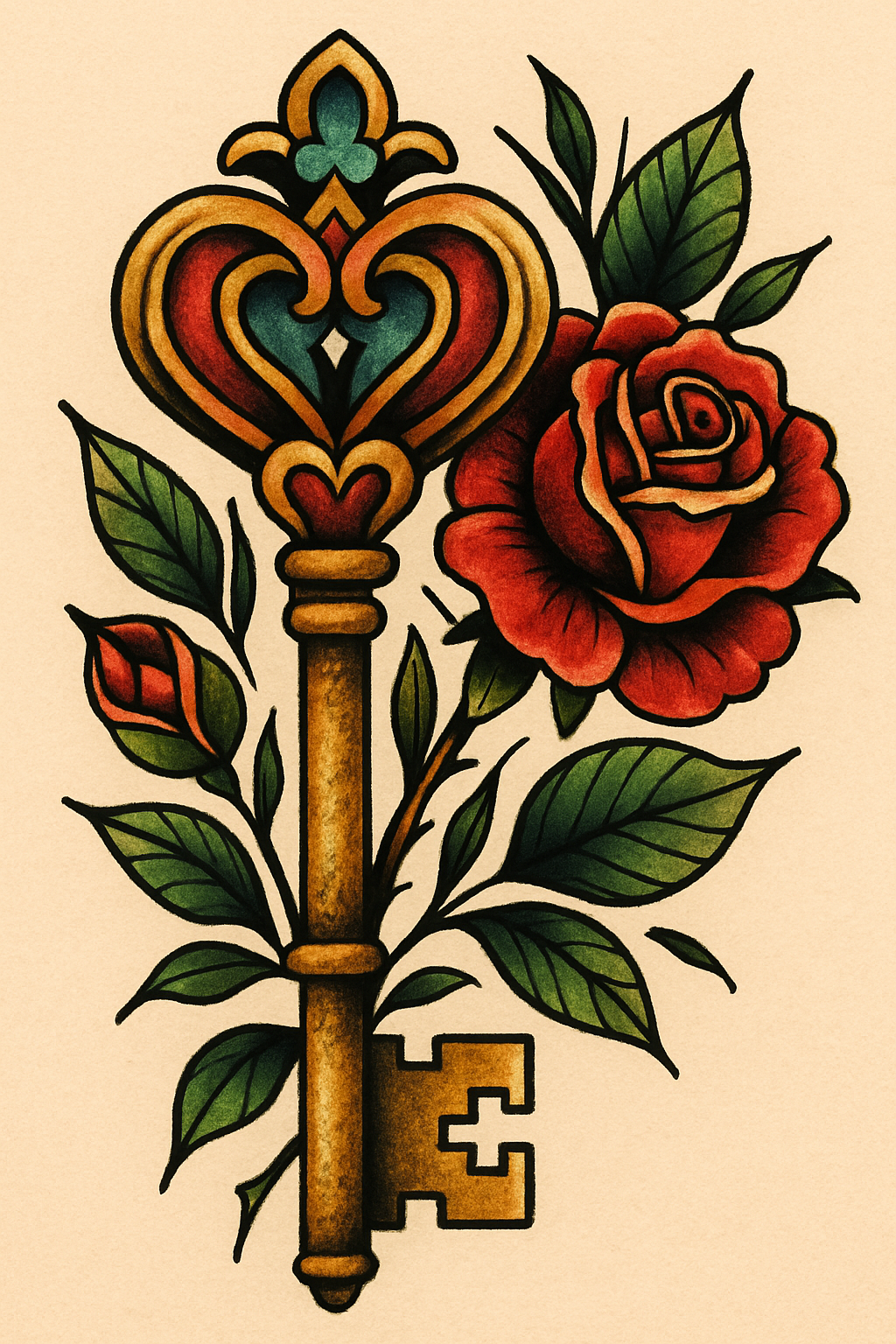/Collection: /by davooda/Type: PNG/This image features a beautifully crafted key intertwined with a red rose, characterized by bold lines and vibrant colors. Ideal for art prints or tattoo inspiration.